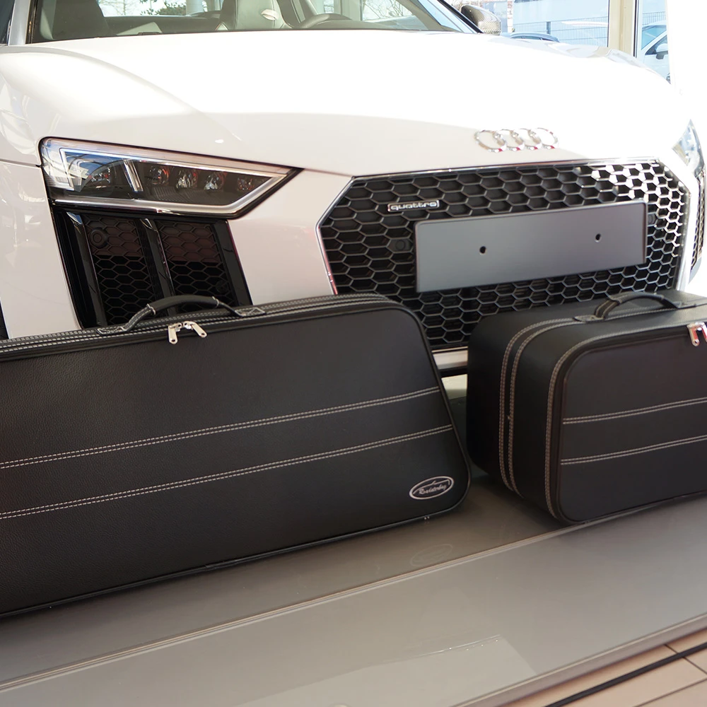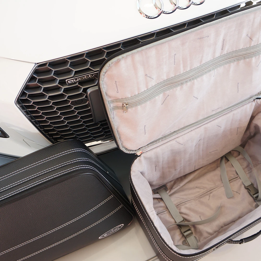 Dieses zweiteilige Kofferset ist die ideale Wahl, wenn Sie mit Ihrem Audi R8 4S Spyder gerne Ausflüge mit großem Gepäck unternehmen. Die zwei praktischen Koffer passen durch ihr Design perfekt in den Kofferraum Ihres Wagens. Hergestellt aus italienischem Leder mit einem hochwertigen Innenfutter aus Ancarra®-Mikrofaser und luxuriöser Stickerei sind diese Gepäckstücke optisch absolut gelungen. Ein innovativer Metall-Kunststoff-Verbundrahmen sorgt für die nötige Stabilität. Dank bequemer Tragegriffe lassen sich die Koffer komfortabel transportieren.
