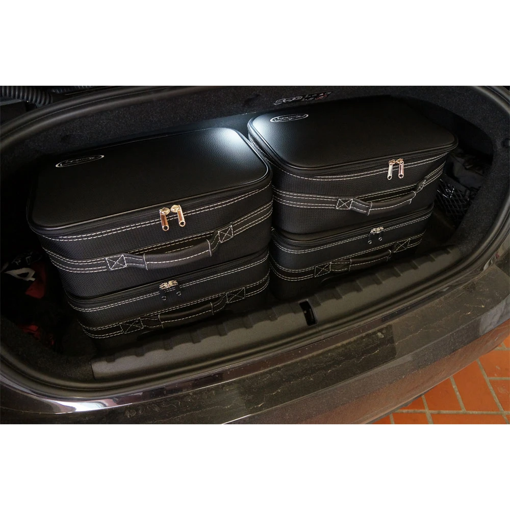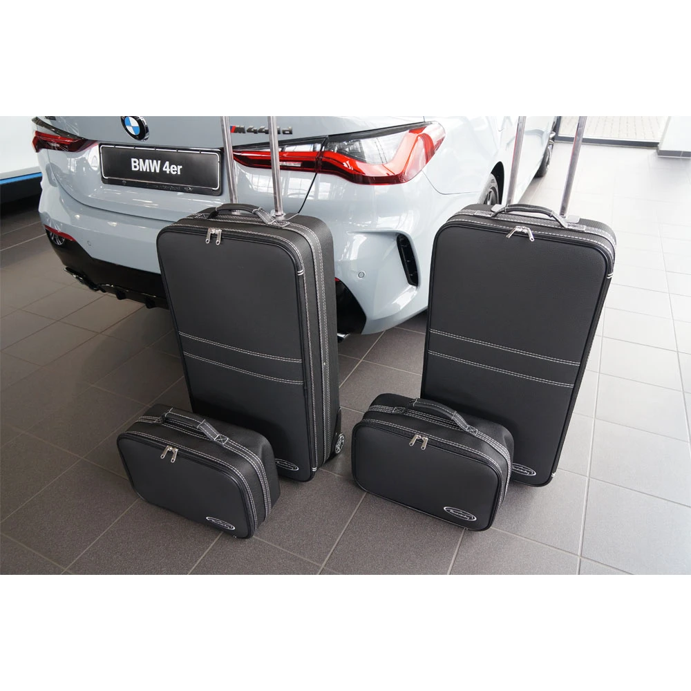 Dieses 4-teilige Kofferset wurde speziell für das BMW 4er Cabrio G23 entwickelt und passt exakt in den Kofferraum, ohne Platz zu verschwenden. So können Sie immer mit maximalem Gepäck auch bei offenem Verdeck auf Tour gehen. Die Koffer verfügen über einen abschließbaren Deckel mit Innenfach (mit Reißverschluss) und Spannbänder für die Fixierung des Kofferinhaltes, damit bei der Reise nichts verrutscht. Die Trolleys verfügen über einen voll versenkbarem Griff und kugelgelagerte, verchromten Felgen mit extrabreiten Reifen und lassen sich so im vollen Zustand einfach fortbewegen. Der Leichtbau-Rahmen der Koffer sorgt für Stabilität und leichte Handhabung, das gestickte Logo, wählbare farbige Nähte und feines Innenfutter aus Ancarra®-Mikrofaser verleihen dem Set eine edle Optik.