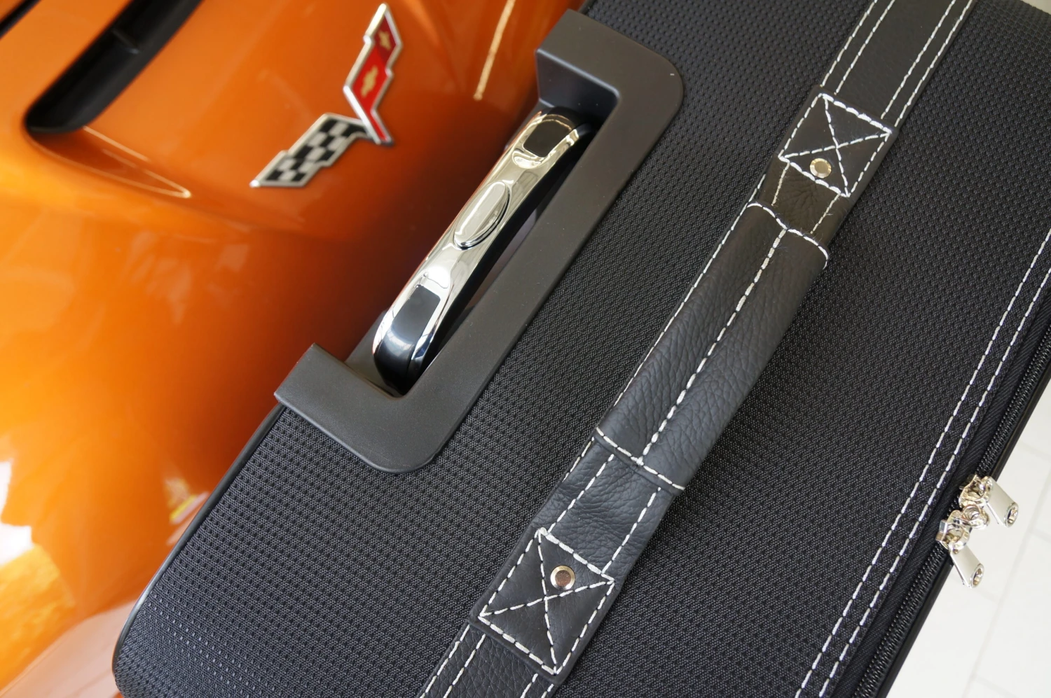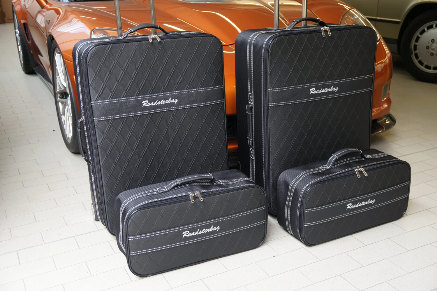 Dieses vierteilige Kofferset von Roadsterbag ist speziell auf den Kofferraum des Chevrolet Corvette C6 zugeschnitten. Die Trolleys und die passenden Koffer nutzen den vorhandenen Stauraum optimal aus. Die Trolleys sind mit voll versenkbarem Griff, silikongedämpften, verchromten Laufrollen, Kugellagerung und Inside-Trolley-Technik aus leichtem Aluminium ausgestattet. Die erstklassige Verarbeitung und das hochwertige Innenfutter aus edler Ancarra-Mikrofaser verleihen dem Set eine edle Optik, die sich nahtlos in das Innendesign Ihres Wagens einfügt. Dank bequemer Tragegriffe und stabilem Rollensystem lassen sich die Gepäckstücke komfortabel transportieren.