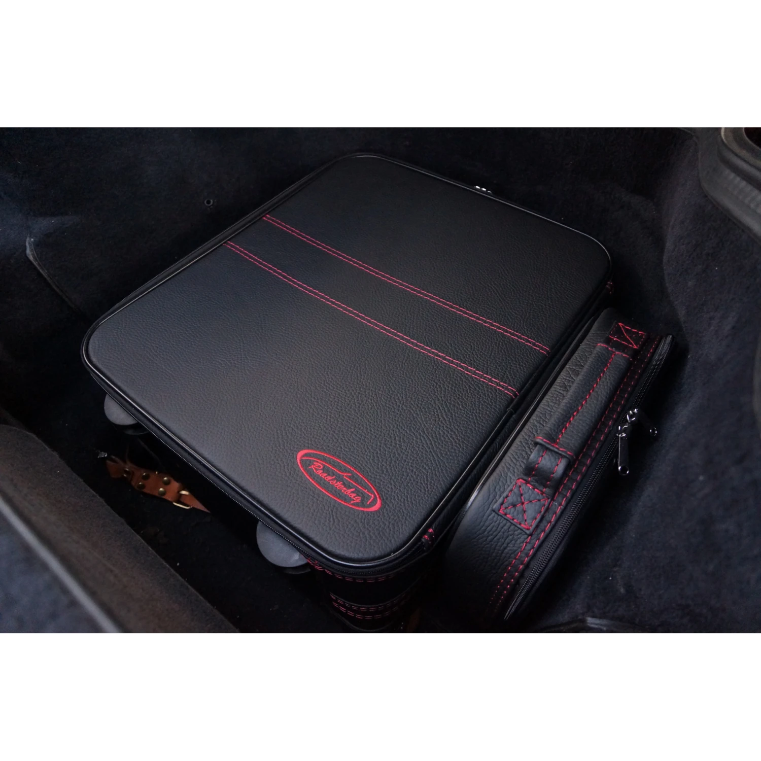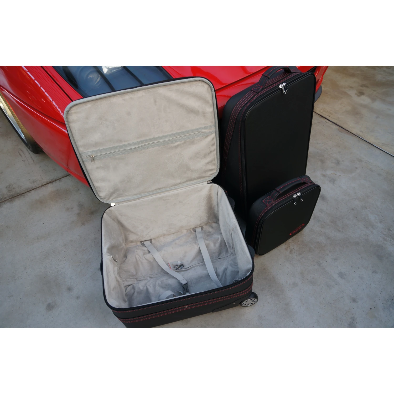 Dieses vierteilige Kofferset von Roadsterbag ist speziell auf den Kofferraum des Ferrari 512 Testarossa zugeschnitten. Der Trolley und die passenden Koffer nutzen den vorhandenen Stauraum optimal aus. Der Trolley ist mit voll versenkbarem Griff, silikongedämpften, verchromten Laufrollen, Kugellagerung und Inside-Trolley-Technik aus leichtem Aluminium ausgestattet. Die erstklassige Verarbeitung und das hochwertige Innenfutter aus edler Ancarra-Mikrofaser verleihen dem Set eine edle Optik, die sich nahtlos in das Innendesign Ihres Wagens einfügt. Dank bequemer Tragegriffe lassen sich die Gepäckstücke komfortabel transportieren.
