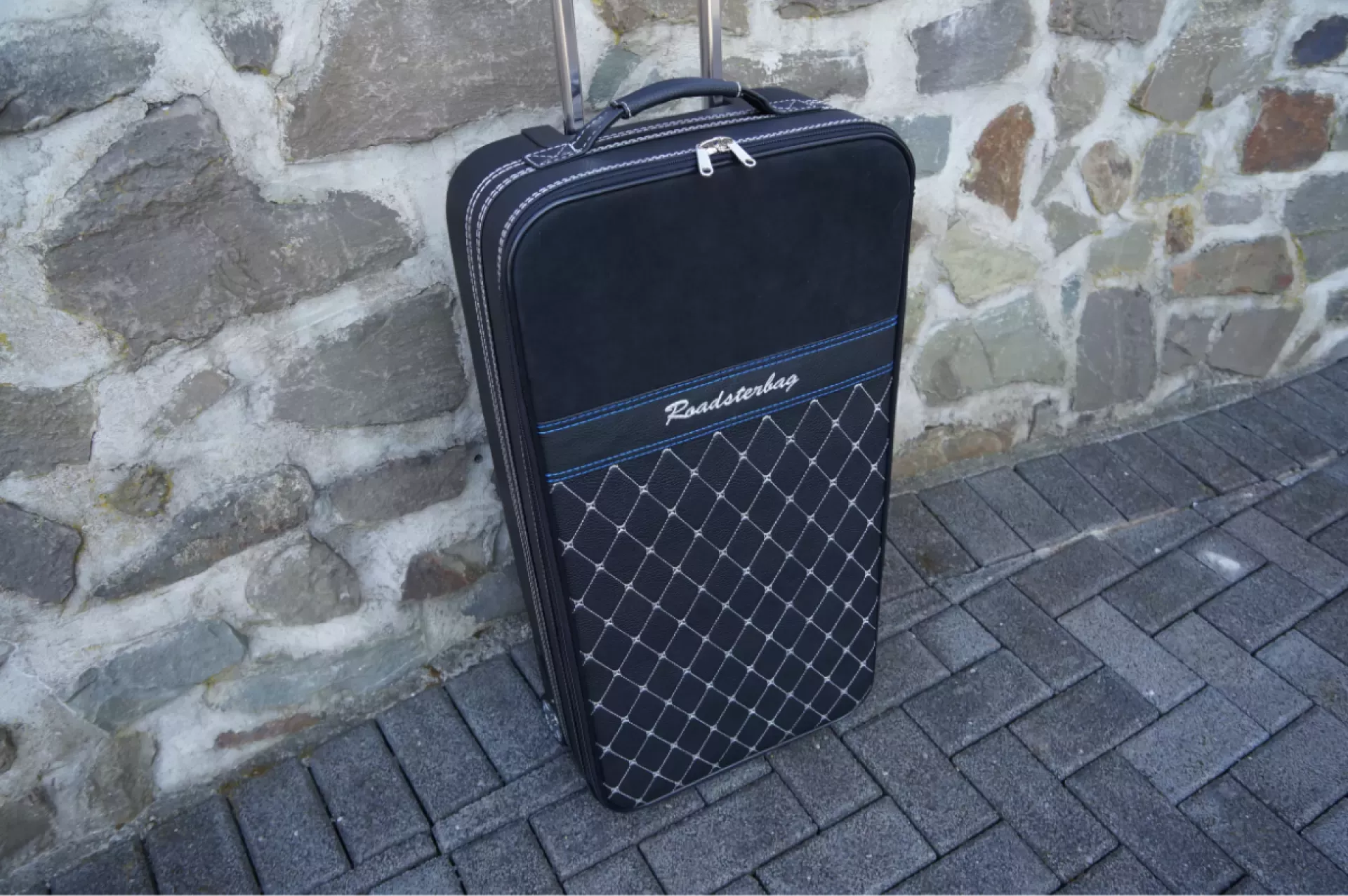 Auch bei diesem Koffer setzt Roadsterbag auf hochwertige, robuste Materialien. Das Obermaterial ist aus Kunstleder und Alcantara. Das komplette Innenfutter ist aus Ancarra Mikrofaser. Der Koffer ist vegan und handgemacht in Europa. Die Ziernähte in silbergrauer und blauer Kontrastfarbe wirken besonders edel auf dem schwarzen Kunstleder.