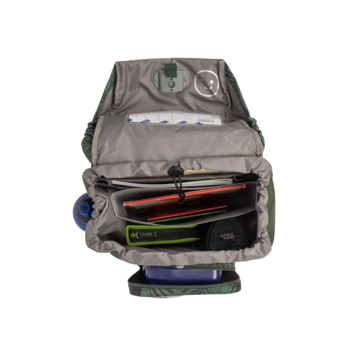 Der Schulranzen Rebel von School Mood kombiniert die Coolness eines Softbags mit den ergonomischen Trageeigenschaften einer bis ins kleinste Detail durchdachten Schultasche. Leicht, geräumig und standfest dank fester Bodenplatte bietet er Platz für alle Schulutensilien. Platzangebot, Alltagstauglichkeit und Ergonomie – hier passt einfach alles. Ein geräumiges Hauptfach mit integriertem Bücherfach hält die schweren Bücher nah am Rücken und alles bleibt, wo es hingehört. Die im Set enthaltene, passende Heftbox schützt Arbeitsmaterialien vor Eselsohren. Die isolierte Reißverschlussfrontasche für die Brotdose ist mit Ablaufösen ausgestattet, falls doch mal etwas ausläuft. Große Seitentaschen mit Klettverschluss für Trinkflasche, Regenschirm und andere Kleinigkeiten sorgen für Ordnung und kinderleichtes Handling.