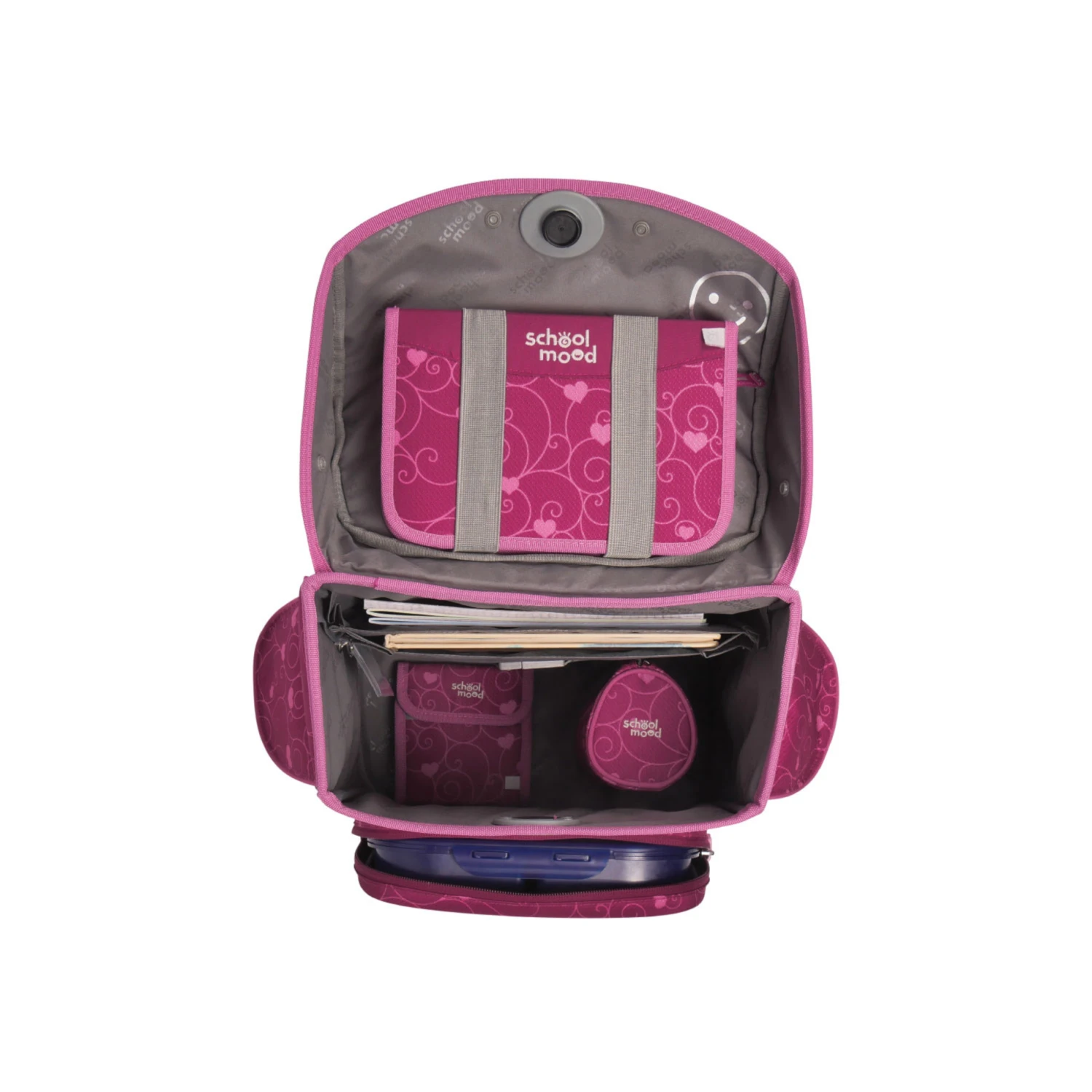 Der Schulranzen Timeless von School Mood in klassischer Ranzenform bietet ein enormes Platzangebot und ist gleichzeitig super leicht und angenehm zu tragen. Ein geräumiges Hauptfach mit integriertem Bücherfach (passend für Heftboxen) hält die schweren Bücher nah am Rücken und alles bleibt, wo es hingehört. Die isolierte Reißverschlussfrontasche für die Brotdose ist mit Ablaufösen ausgestattet, falls doch mal etwas ausläuft. Große Seitentaschen mit Klettverschluss für Trinkflasche, Regenschirm und andere Kleinigkeiten sorgen für Ordnung und kinderleichtes Handling.